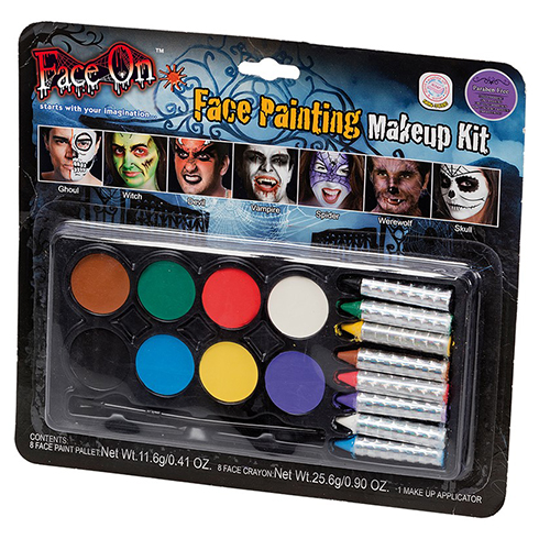 Innehåller 8 ansiktsfärger, 8 färgkritor, 1 pensel